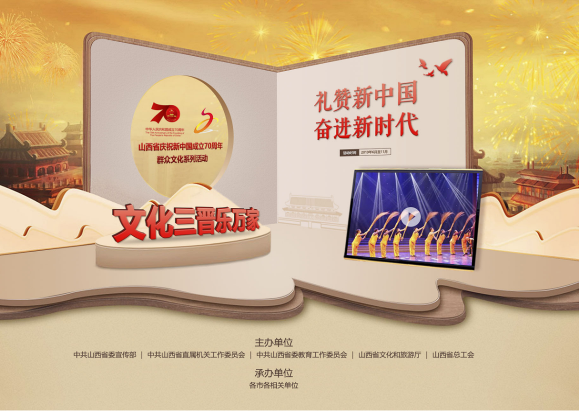 2019年是新中国成立70周年,在举国同庆这一具有历史意义的伟大节点之际,山西省庆祝新中国成立70周年群众文化系列活动(以下简称“系列活动”)于6月正式启动。系列活动由山西省委宣传部、山西省文化和旅游厅等五部门共同举办,纳入全省庆祝新中国成立70周年系列活动重点内容,是继庆祝改革开放40周年群众文化系列活动之后的又一次全省性大规模群众性文化盛会,也是文旅深度融合后的一次高起点谋划。